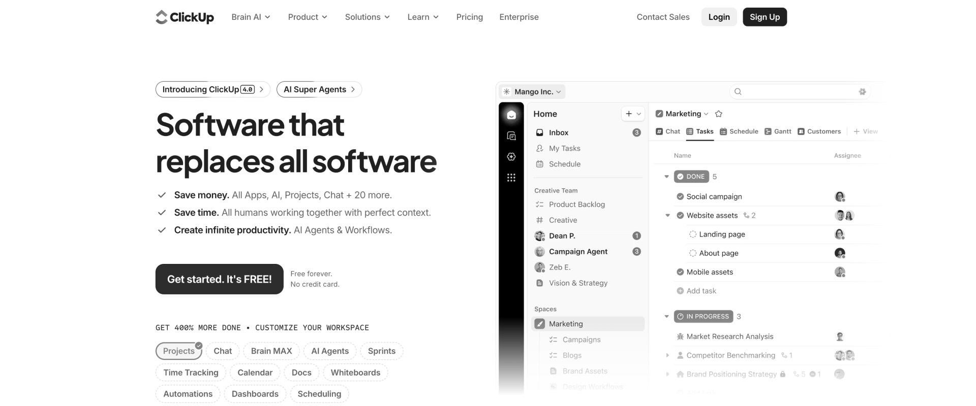 ClickUp Customizable all-in-one workspace SMB → Mid-market ~4.7 Free; paid starts ~$5–$7/user/mo Broad feature set at low cost