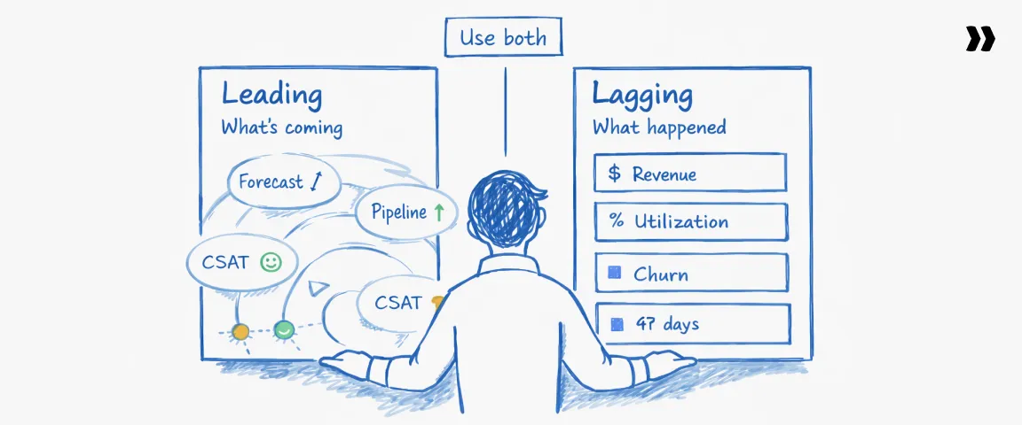 Leading KPIs in professional services indicate future performance trends before they appear in financial results. Examples include a 30-day utilization forecast, milestone completion rate, or mid-project CSAT pulse. Lagging PS KPIs confirm outcomes that have already occurred, such as quarterly revenue, project margin, or annual churn rate.