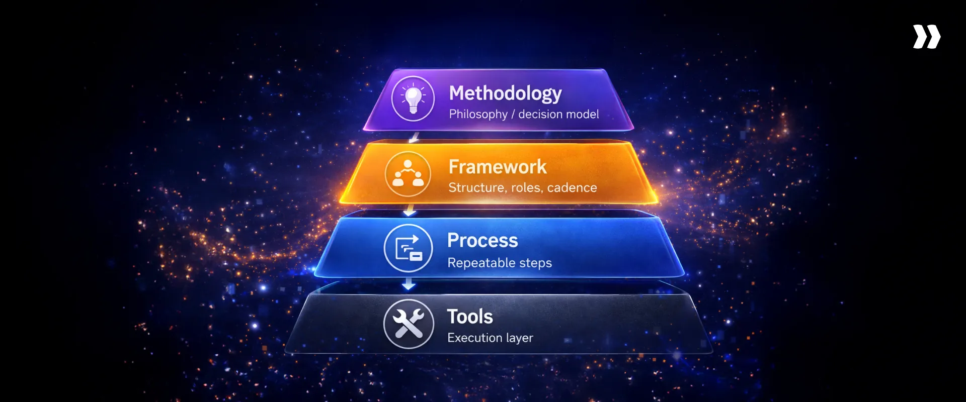 How methodologies, frameworks, processes, and tools differ in intent, structure, and execution