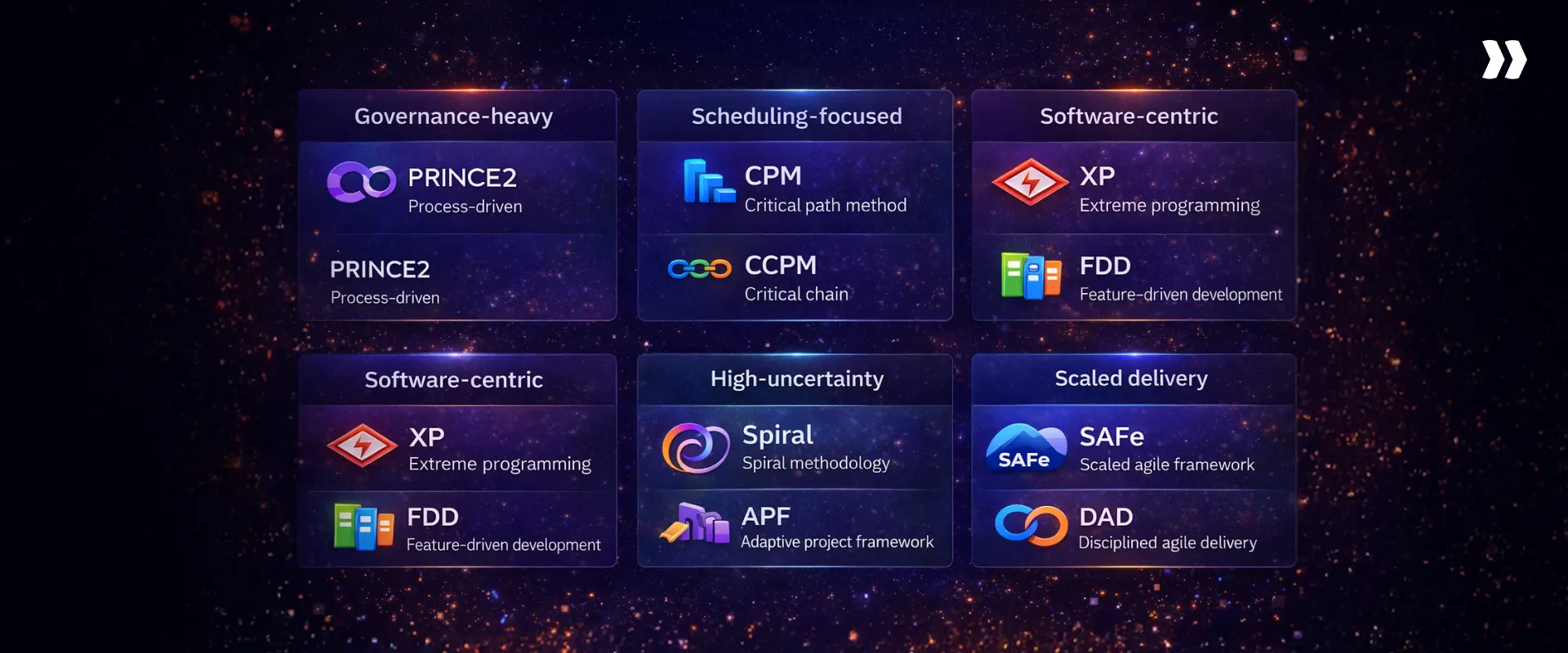 In more mature organizations, methodologies also play a governance role. They standardize how decisions are escalated, how risks are identified and tracked, and how delivery performance is evaluated across portfolios.